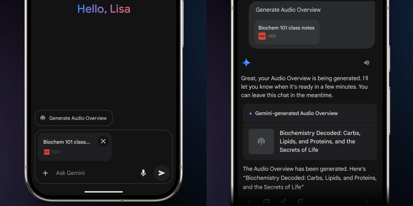 As announced earlier this week, the Gemini app is getting the ability to generate Audio Overview podcasts, with Android and iOS users beginning to see this capability today.