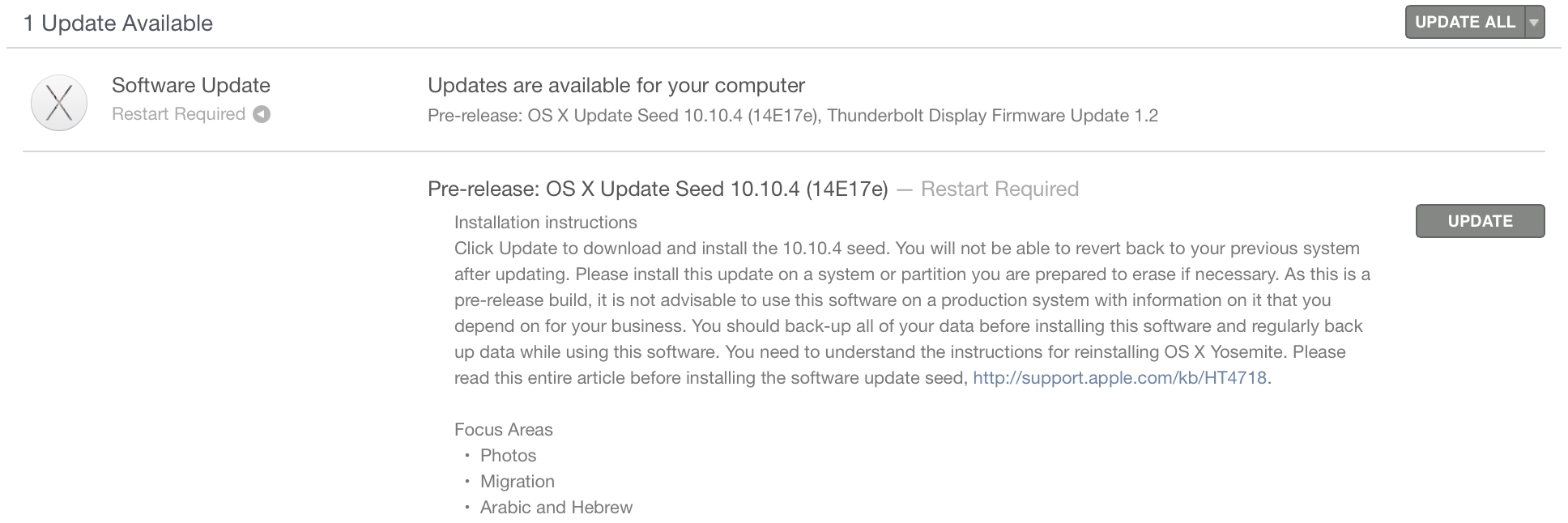Alongside today’s new iOS 8.4 beta, Apple has released yet another beta build of the upcoming OS X Yosemite 10.10.4 to developers. Today’s build is labeled as build number 14E17e, and it is available via Software Update in the Mac App Store for developers running earlier versions of the beta. A new Public Beta for AppleSeed users is available as well. It is possible that 10.10.4 will be released in June alongside iTunes 12.2 (with the new Apple streaming music service). For the focus areas, Apple tells developers to pay special attention to the Photos application, the Migration Assistant, and Arabic and Hebrew language support.