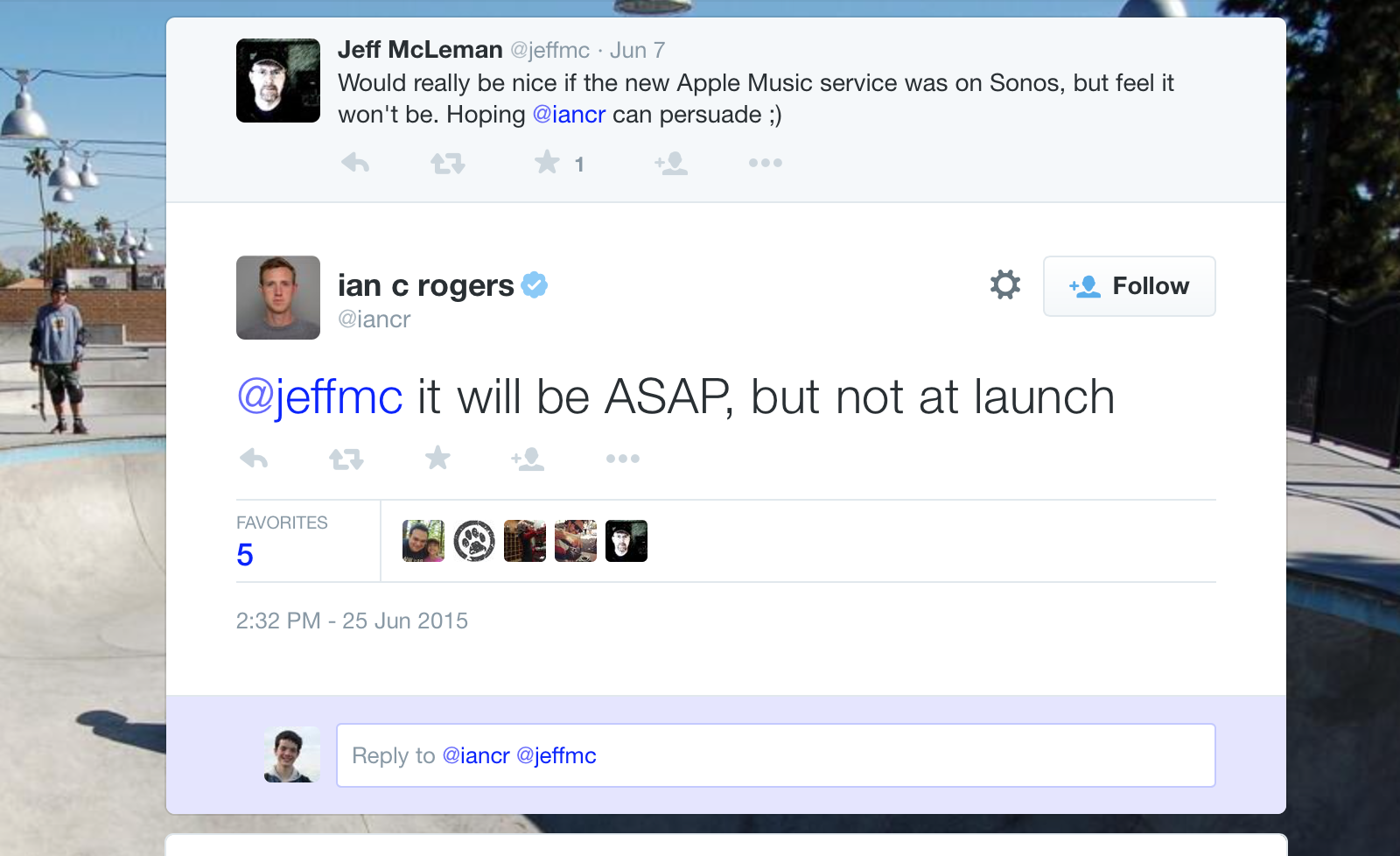 Apple Music senior director Ian Rogers — ex Beats Music CEO — has announced on Twitter that integration with Sonos for Apple Music is coming as soon as possible. Although Beats Music did have native support on the popular internet-connected speaker system, there have been no announcements about a partnership with Apple Music so far. In the tweet, Rogers confirms that there will be no Sonos integration at launch.