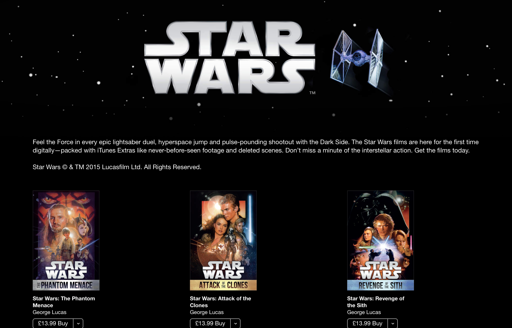 Apple is also running a special Star Wars Apple Music Radio station, as we reported earlier in the week, in coordination with various other promotions of Star Wars content across the iTunes Store. You can download all six previous films as a digital movie collection for $90 (Amazon is selling the same collection also for $90, so iTunes is competitively priced).