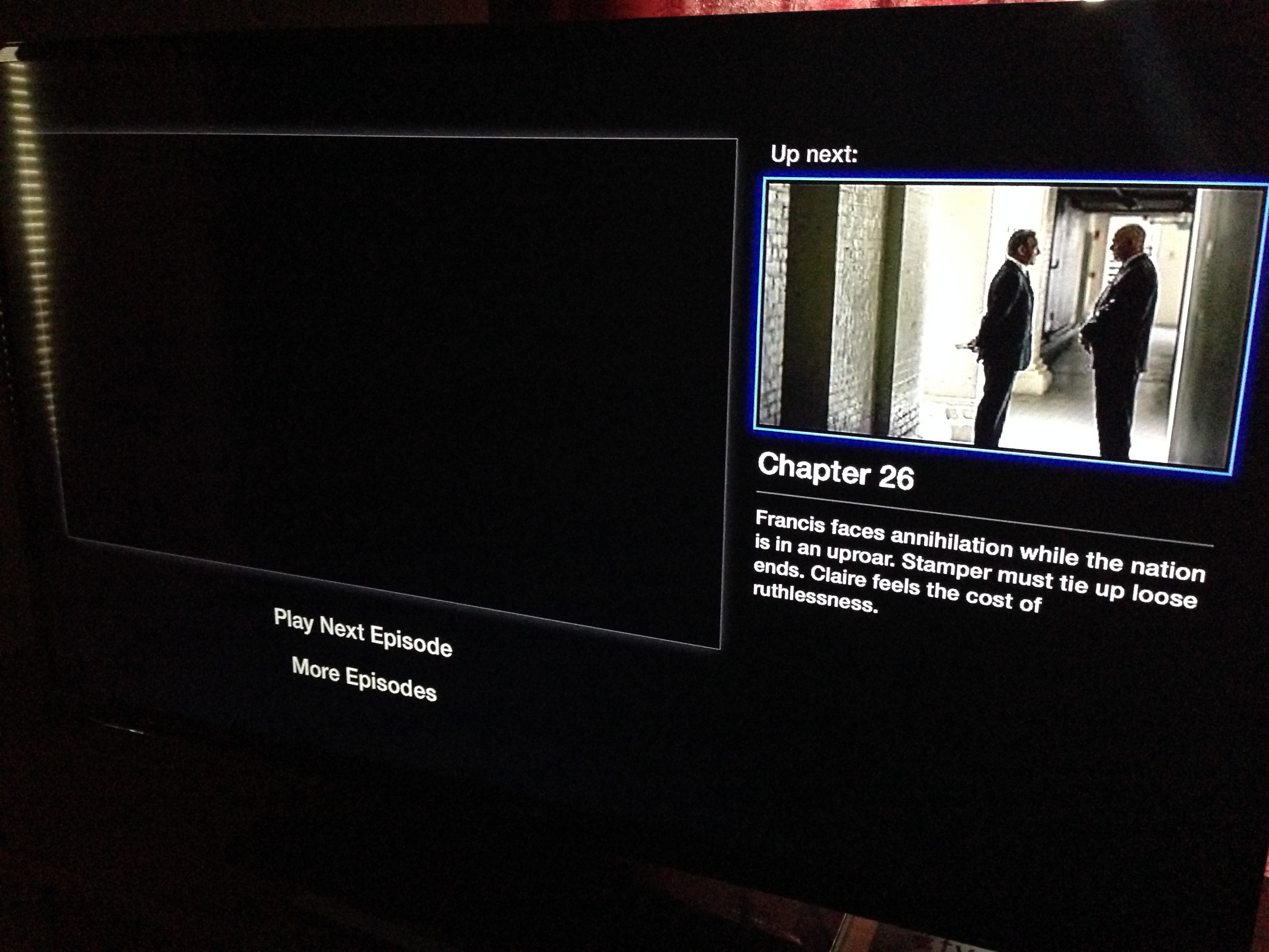The Netflix player on Apple TV has been updated with a new feature that allows watchers to more quickly jump between episodes in a single series of a show. When one episode is complete, the Apple TV will offer up the next episode. You must physically select the next episode as it will not automatically play, according to our testing (Update: the auto-play feature seems to be working on some shows, but not all at the moment). Previously, to access the next episode, users would have to revert back to the main episode list panel within the Netflix app.