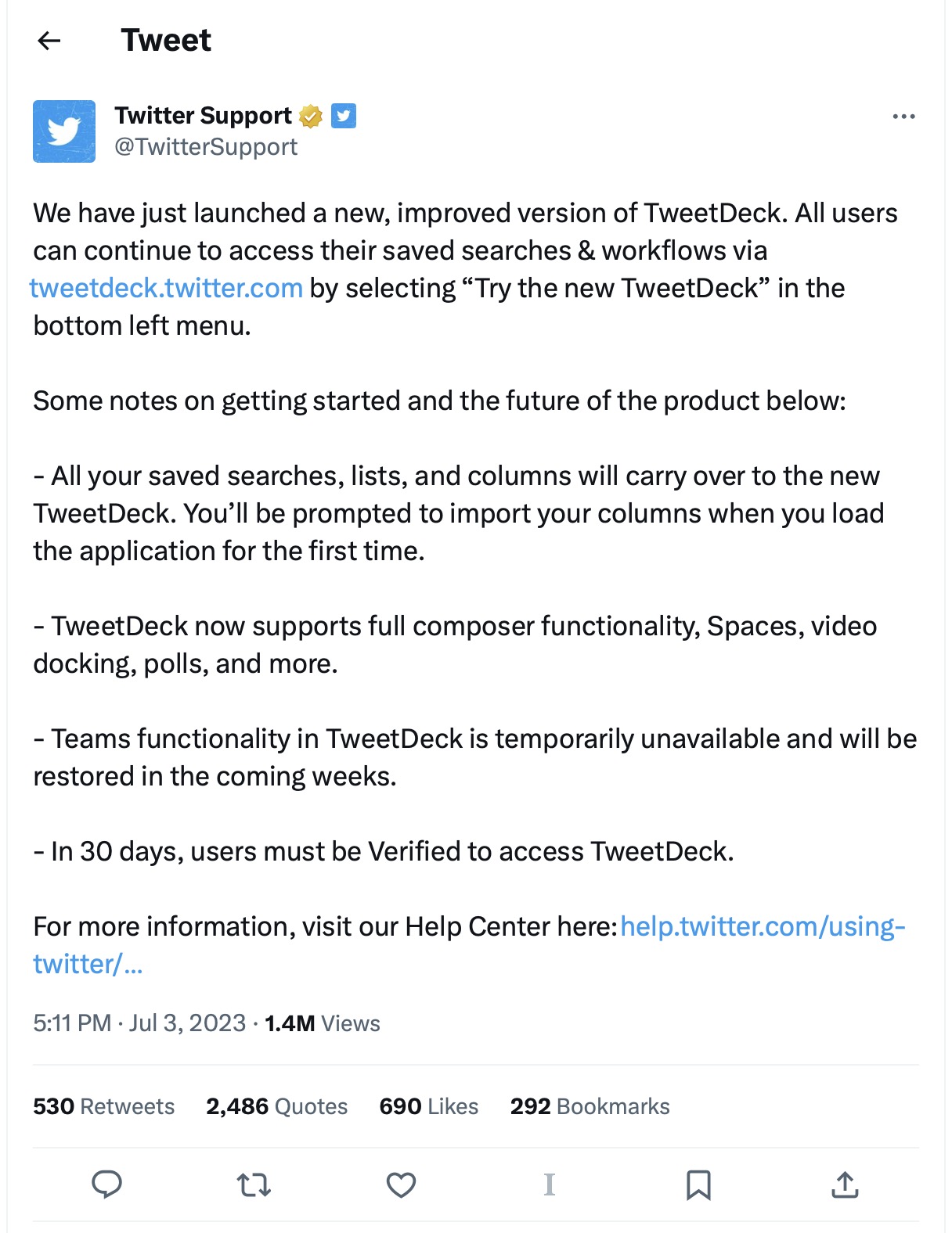 For those who didn’t get unceremoniously and non-consensually bumped onto the new version of TweetDeck, the old version is working again. Users who did get force-switched can also revert to the old version – but don’t expect it to last for long …