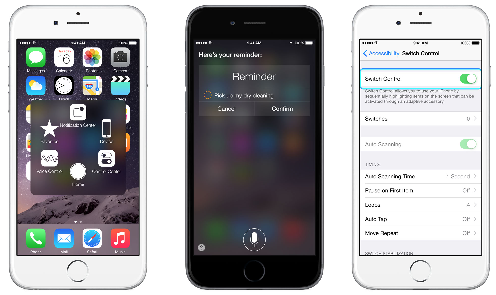 • Use iOS accessibility features like Zoom, Assistive Touch, and Stereo to Mono, as well as peripheral braille displays.