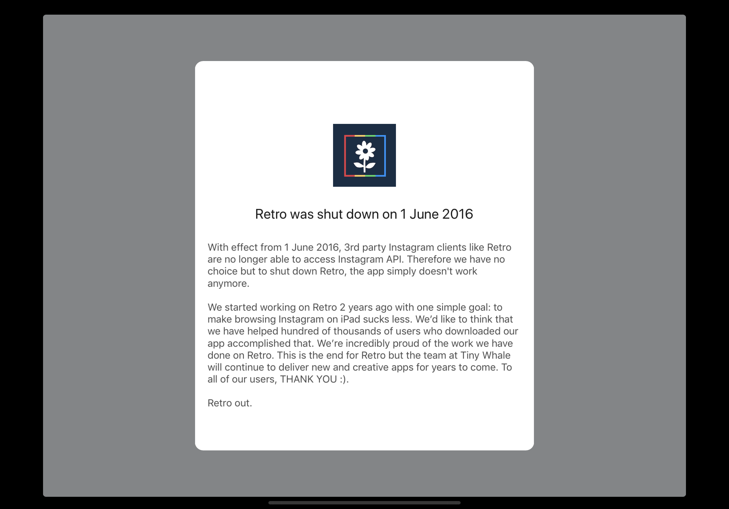 Retro for Instagram was a great solution, for example, but Instagram changed its API that gave developers access to the service in their apps. Instagram killed the market for iPad app alternatives without making its own.