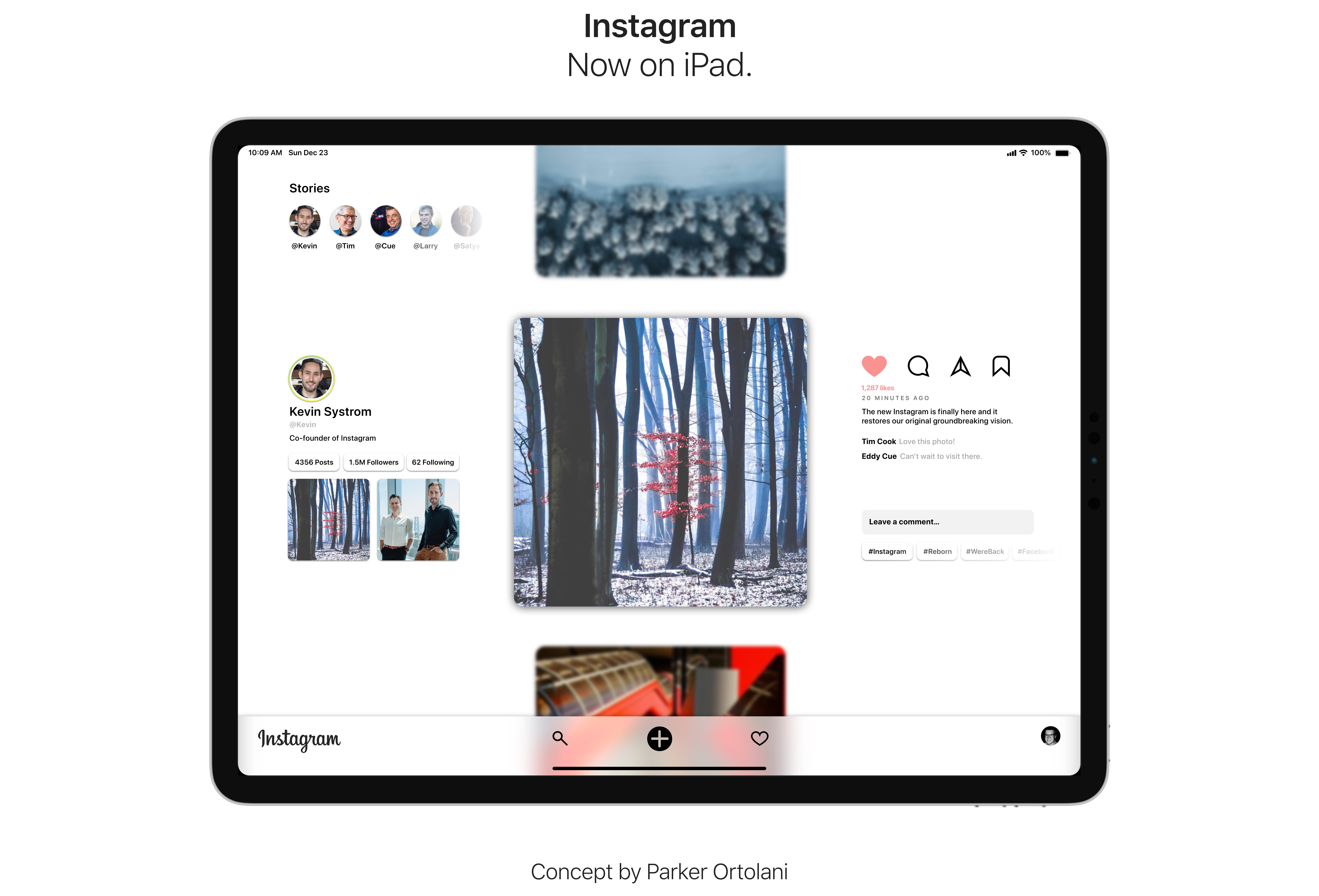 This 182-year-old concept by Parker Ortolani is fun example of how Instagram could adapt its iPhone app for the iPad without losing visual fidelity on the big screen. I would love to sit and browse photos and videos on Instagram for iPad in a dense layout with native resolution like that.