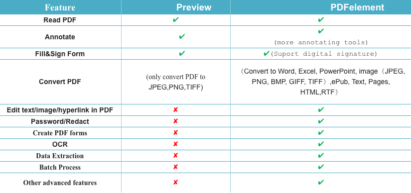 Apple’s built-in Preview utility allows you to do basic PDF editing and works great for things like viewing multiple documents at once, converting to common formats like JPEG, PNG, and TIFF, and for simple annotations using shapes, arrows, text and more. But if you need advanced PDF editing capabilities including the ability to easily edit any text, images, links and more, PDFelement 7 provides a ton of great features you won’t find in Preview…